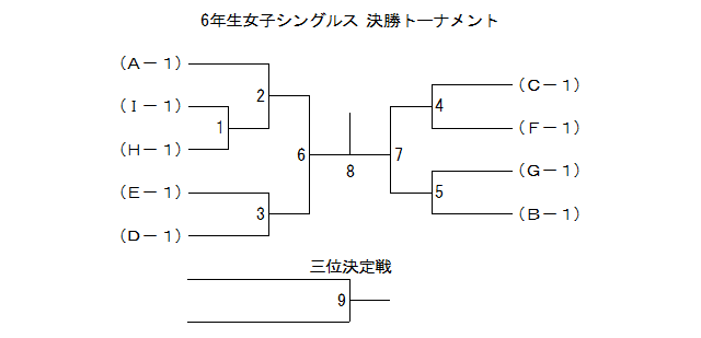 | 6年生女子シングルス Eブロック | 下前 | 清水 | 西山 | 順位 |